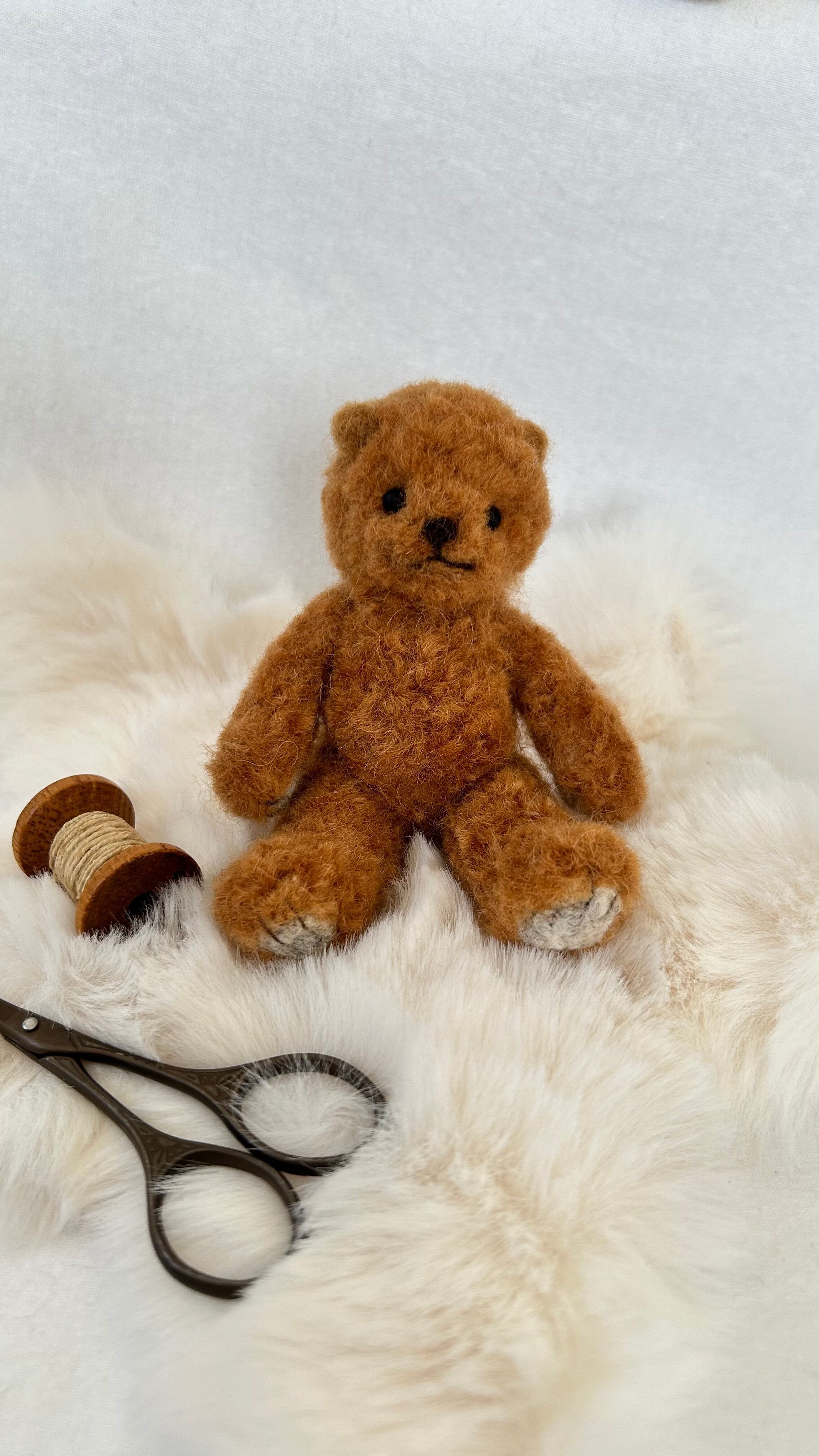 素材:ウール100%、艶消しオニキスビーズアイ、リボン、オリジナルチャーム